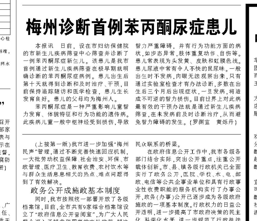 梅州诊断首例苯丙酮尿症患儿的报导(梅州日报)